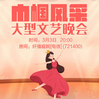 2023年3月4日讯 新的一年,新的希望,我们怀揣新的梦想,开始新的新的征程。2023年3月3日晚八点,在综艺专区群星璀璨纤禧庭院[电信]721400房间,举办了《巾帼风采》大型文艺晚会。阳春三月,春风徐徐,桃花盛开,在三八妇女节也即将来临,为了表达我们对女性的特别关爱,丰富大家的业余文化生活,群星璀璨区纤喜庭院房间特举办《巾帼风采》大型文艺晚会活动,迎接“三八妇女节”的到来,让广大女性朋友们展示自己的风采,充分把节日的喜悦渲染开来。