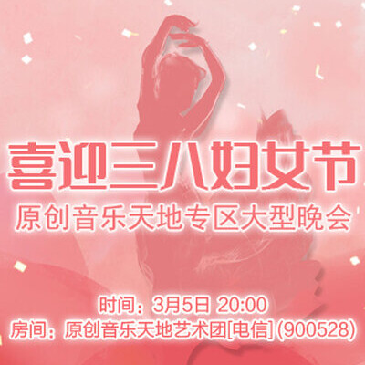 2026年3月6日讯 2026年3月5日20:00,在聊天大厅->原创音乐天地->原创音乐天地艺术团[电信](900528)房间,举办原创音乐天地专区《喜迎三八妇女节》大型晚会。以此丰富聊友们的业余生活,增强团队凝聚力,增进朋友之间的真诚友谊,展现朋友们的个人才艺,让更多人了解走进原创音乐天地艺术团这个温馨的大家庭,同时也宣传新天地分区,展示自我风采,打造和创建VV绿色和谐的文明形象,为朋友们提供了一个广阔的娱乐宣传平台。使我们的网络文化更加丰富多彩!